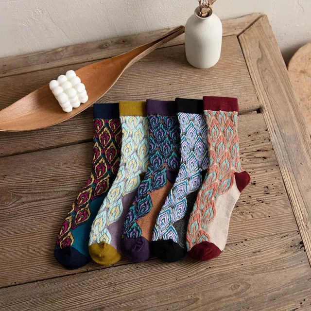 5 Pairs Vintage Peacock Feather Knit Socks for Women – Autumn Winter Style