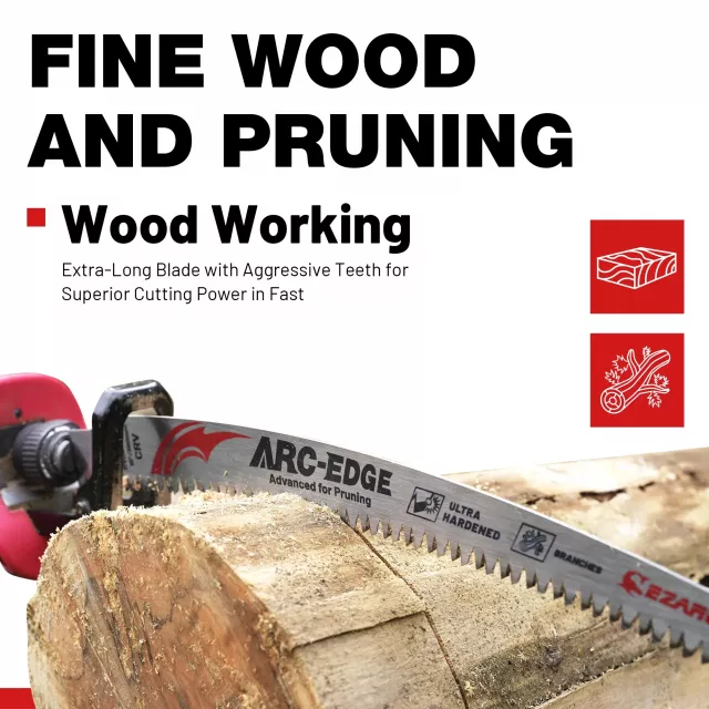 Each blade features an extra-long 15-inch arc edge that slices through tough wood up to 12 inches thick—cutting up to 30% faster than standard pruning blades. The Japanese triple-ground teeth provide exceptional sharpness and aggressive cutting action, while the curved edge minimizes friction and prevents binding. Enjoy smooth, precise cuts every time without snagging or fatigue.