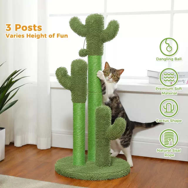 Cactus Cat Scratching Post with 3 Natural Sisal Poles and Interactive Ball