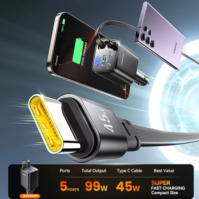 Retractable 99W Fast Car Charger USB-C Adapter for All Devices